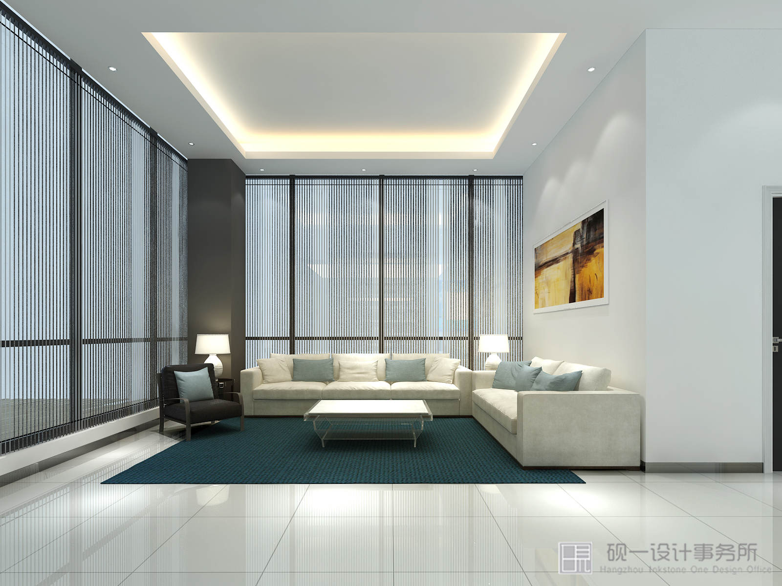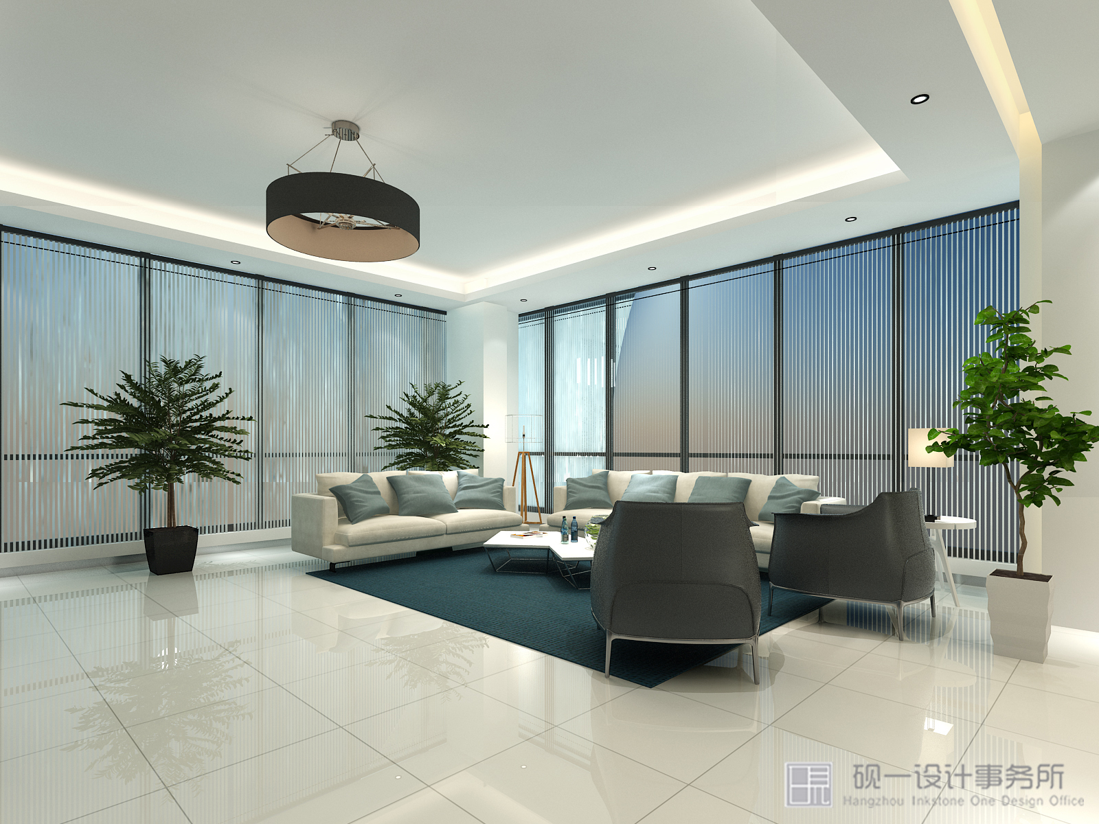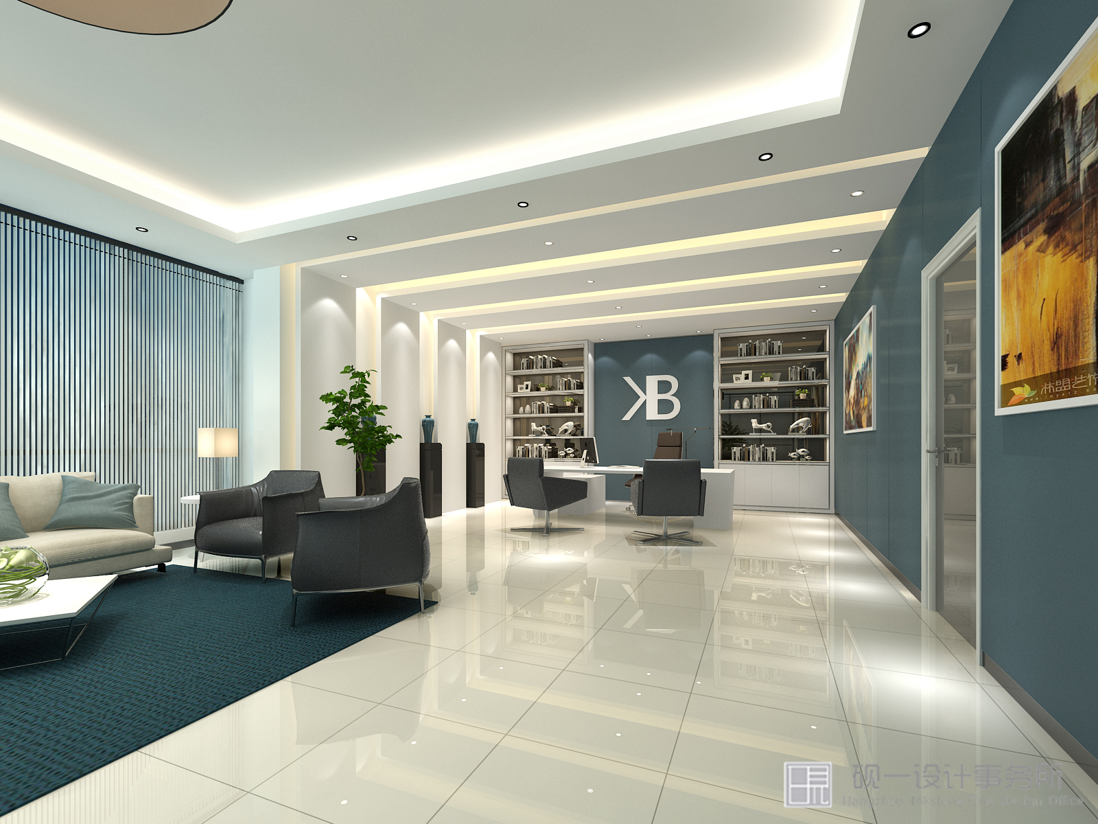 墨蓝与白色是设计“活泼”与“自由”的代名词,大量自然材料和自然光线的运用,消解了拘谨,给人轻松、趣味的视觉感受。顶面墨蓝与整个环境建立一种亲切联系,释放压力铺垫出企业理念与文化,俩个精美的休息区是起到画龙点睛的作用,充满人文情感的大自然气息,令整个空间灵动无比。