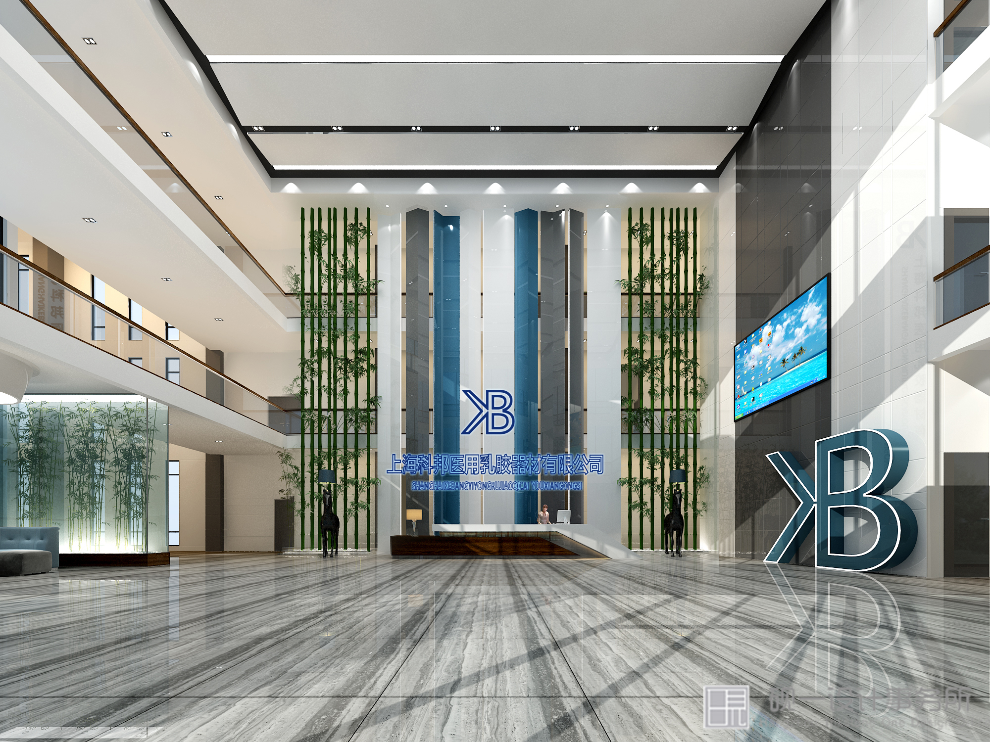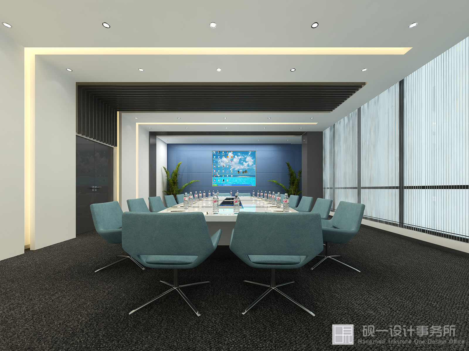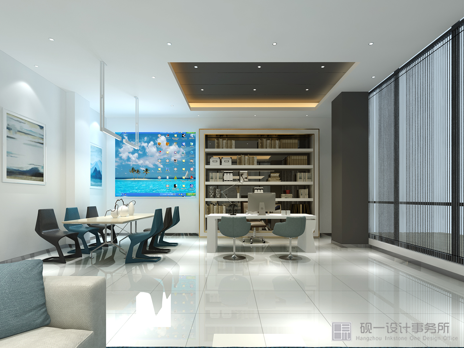 墨蓝与白色是设计“活泼”与“自由”的代名词,大量自然材料和自然光线的运用,消解了拘谨,给人轻松、趣味的视觉感受。顶面墨蓝与整个环境建立一种亲切联系,释放压力铺垫出企业理念与文化,俩个精美的休息区是起到画龙点睛的作用,充满人文情感的大自然气息,令整个空间灵动无比。